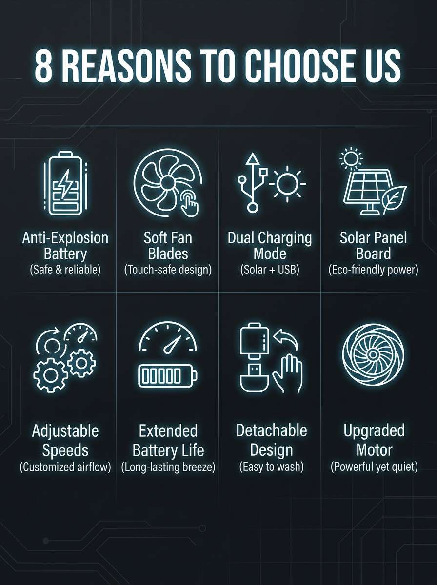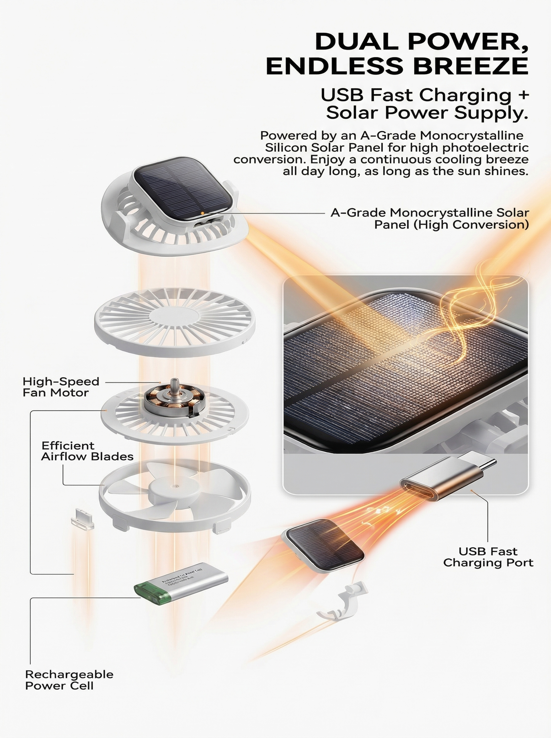 - Dual-Power Innovation: Equipped with high-efficiency A-Grade Monocrystalline Solar Panels and a USB rechargeable battery. Enjoy continuous airflow all day long, regardless of the weather.